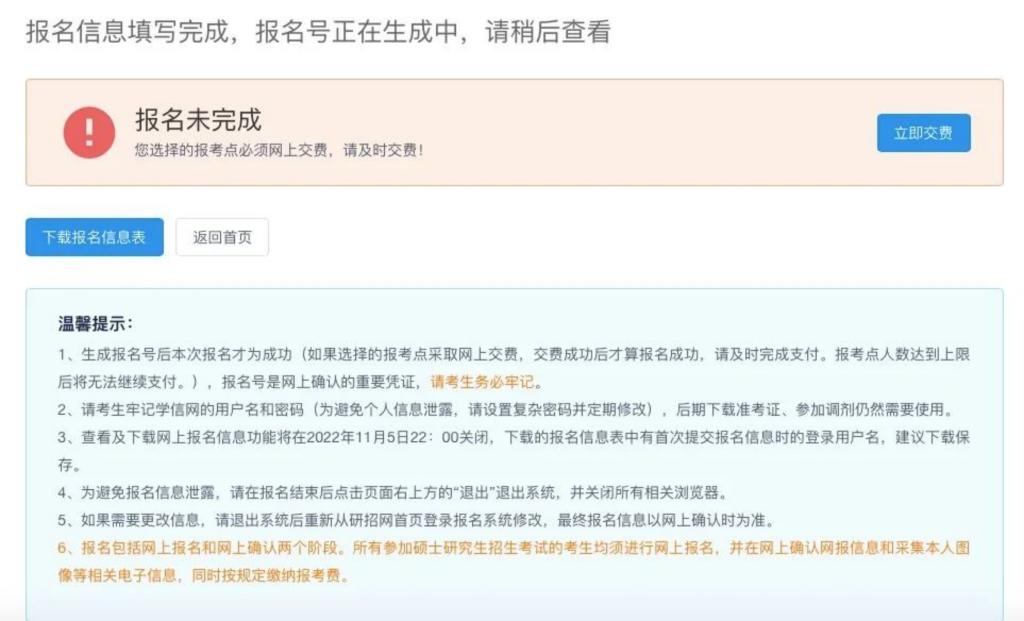 生成报名号,并按照报考点要求进行缴费