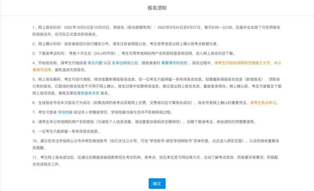 3、报考退费事宜:1)-截止2022年10月25日统考网报结束前取消报名的,由于系统或网络原因造成的同一订单号(或报名号)重复支付的由研招网统一安排退费;2)-如未进行网上确认(现场确认)、网上确认(现场确认)审核不通过等其他情况,由报考点所在各省级教育考生考试机构确认是否予以退费。退费处理将于本年度12月进行,预计最晚于12月底前完成,请耐心等待。