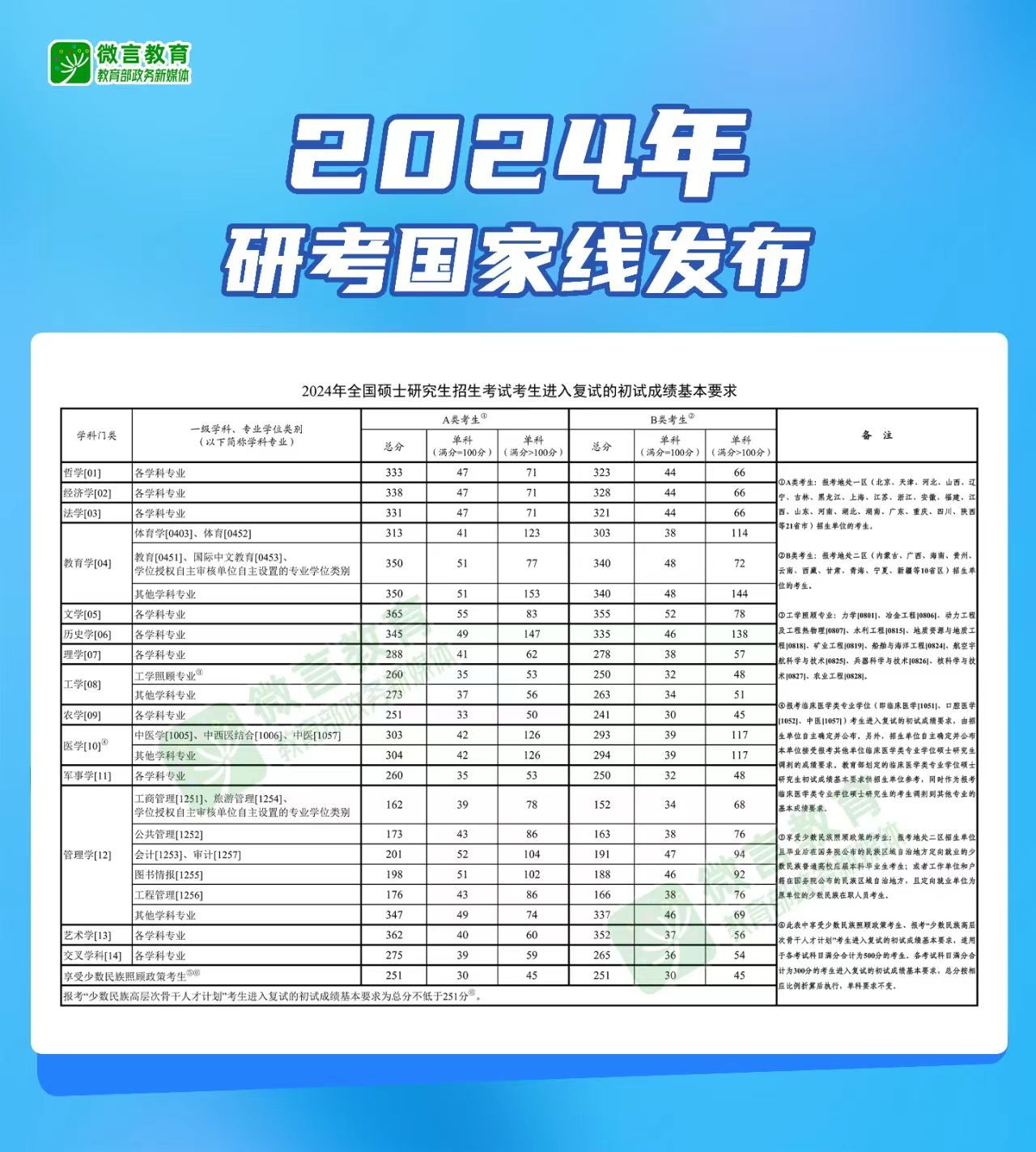 教育部同时发布《2024年全国硕士研究生招生考试考生进入复试的初试成绩基本要求》(国家分数线)。各招生单位根据《2024年全国硕士研究生招生工作管理规定》,在国家分数线的基础上,自主确定并公布报考本单位的考生进入复试的初试成绩要求及其他学术要求。