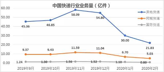 业务量上,2020年前两个月无论是异地、同城还是国际快件都显著下滑,其中异地和同城业务快件量相比高峰时期已然腰斩。