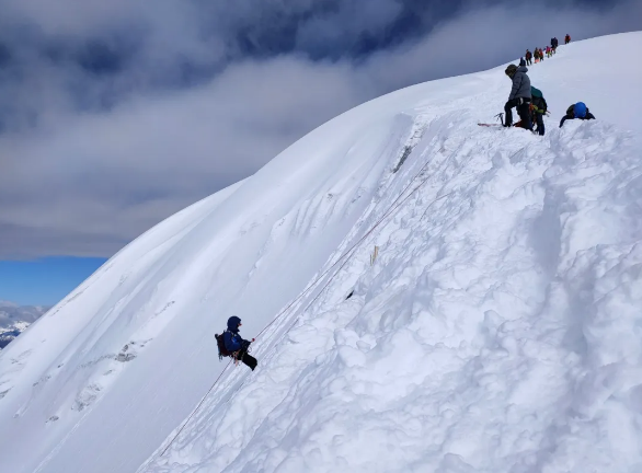 继续独自上升至技术路段,面前是一大块50米高的雪坡,65度的坡度哪怕攀登者使用路绳攀爬也非常吃力和危险。此时我们队的路绳在我搭档身上,而我已经离他太远了,别的队的路绳又不能使用,经过评估我开始对面前这个50米高的雪坡进行Free solo攀登,Free solo就是无保护攀登,一旦攀登者失误或体力不支后果将不堪设想。我整理好情绪,向雪坡发起了冲击。在快速free solo雪坡的过程中,身边的商业队队员一脸诧异地看着我。越往上越陡,雪面在我反复踢蹬下开始塌陷,基本上是上升一步,下滑一步。拼命踢蹬了数次之后发现自己只上升了一点点。没办法,只能上,否则倒攀下去更危险。此刻的绝境已经完全激发出了我求生的本能,我开始加快踢蹬的速度,手中的行走镐的挥动频次也更快了。因为没有携带技术镐(技术镐是成对使用,一般用于攀登陡坡和冰面),所以只能右手使用行走镐,左手挥拳砸入雪面进行攀登。