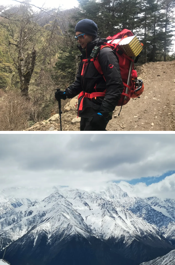 上午7:30,我们一行三人从古贡嘎寺整装出发,通过河谷一路攀升到BC营地,在BC营地稍作休整,继续攀升至高BC营地,从BC营地至C1营地需要经过4个陡坡的爬升,路途更是蜿蜒曲折、百转千回,到达海拔4000米已经出现雪线。经过一路爬升至海拔4800的C1营地已是18:00。途中一名队员也出现了体力不支的情况,水也全部耗尽。我和我搭档当机立断:我搭档以最快的速度到达C1营地搭建帐篷并烧水,我在后方确保该队员的安全并一同攀升,经过不断鼓励,这名队员终于安全抵达C1营地。当日重装攀升8公里,海拔上升1100米。