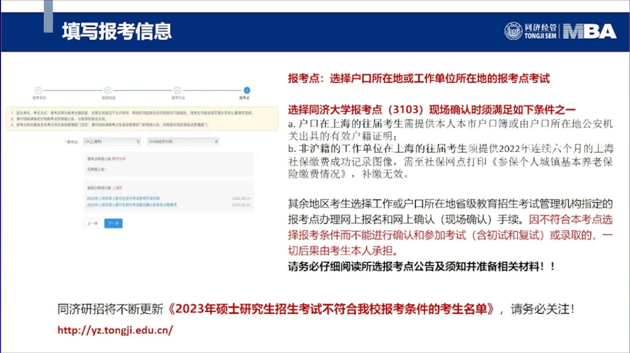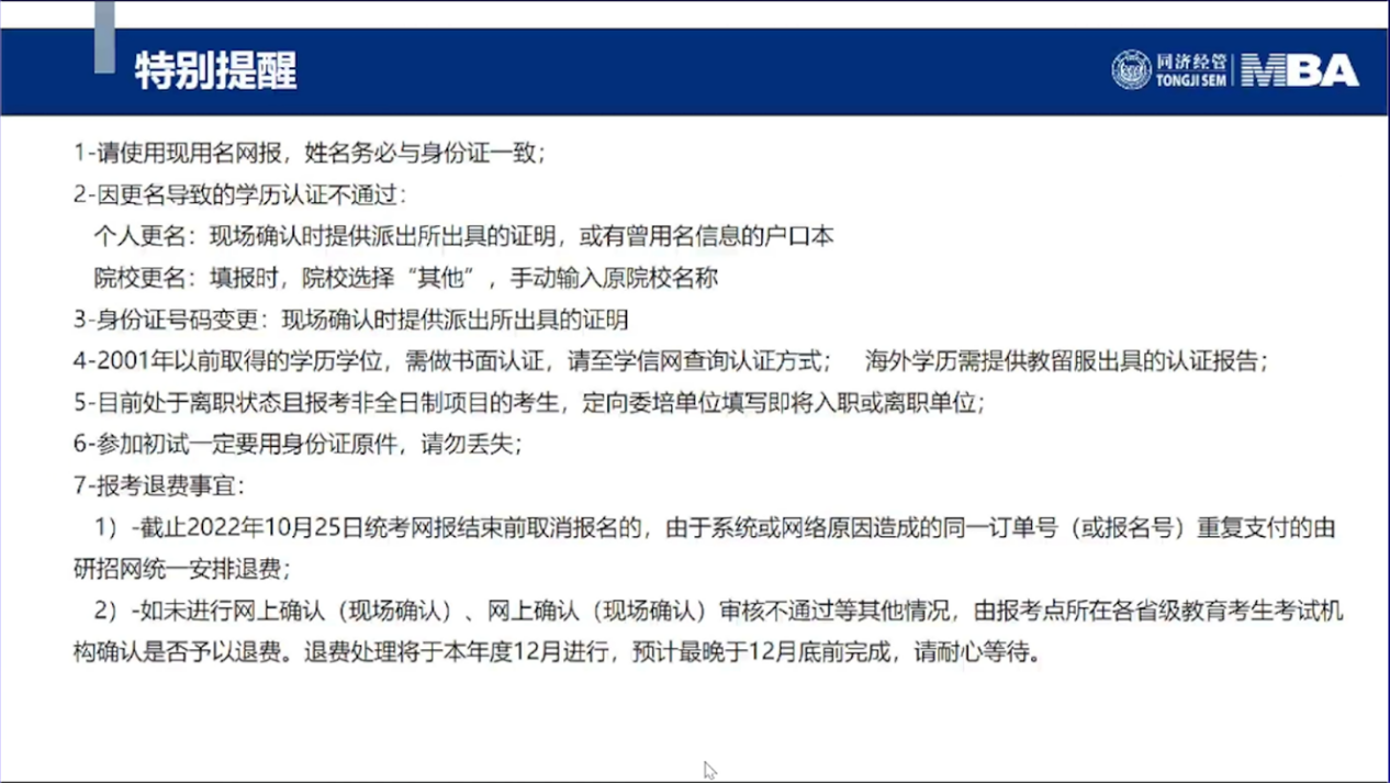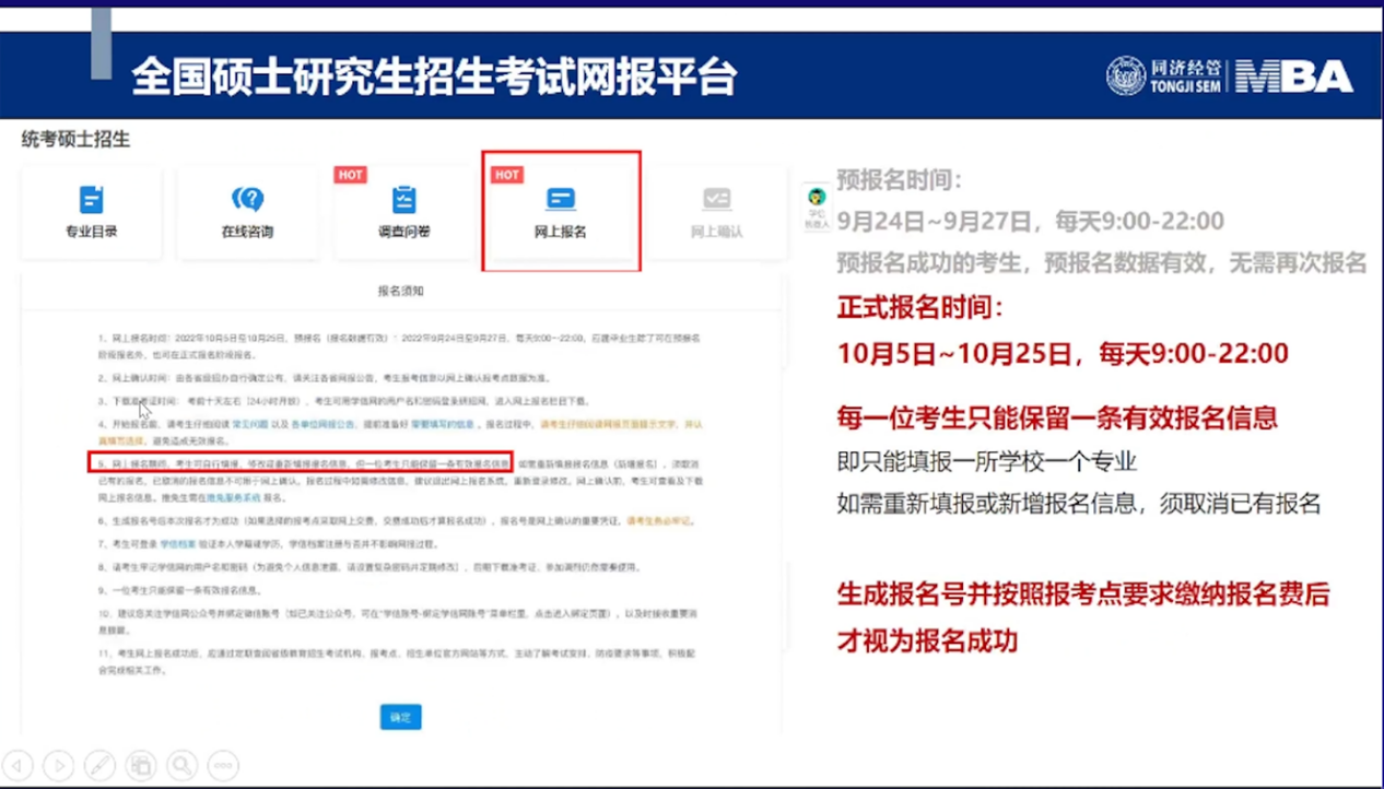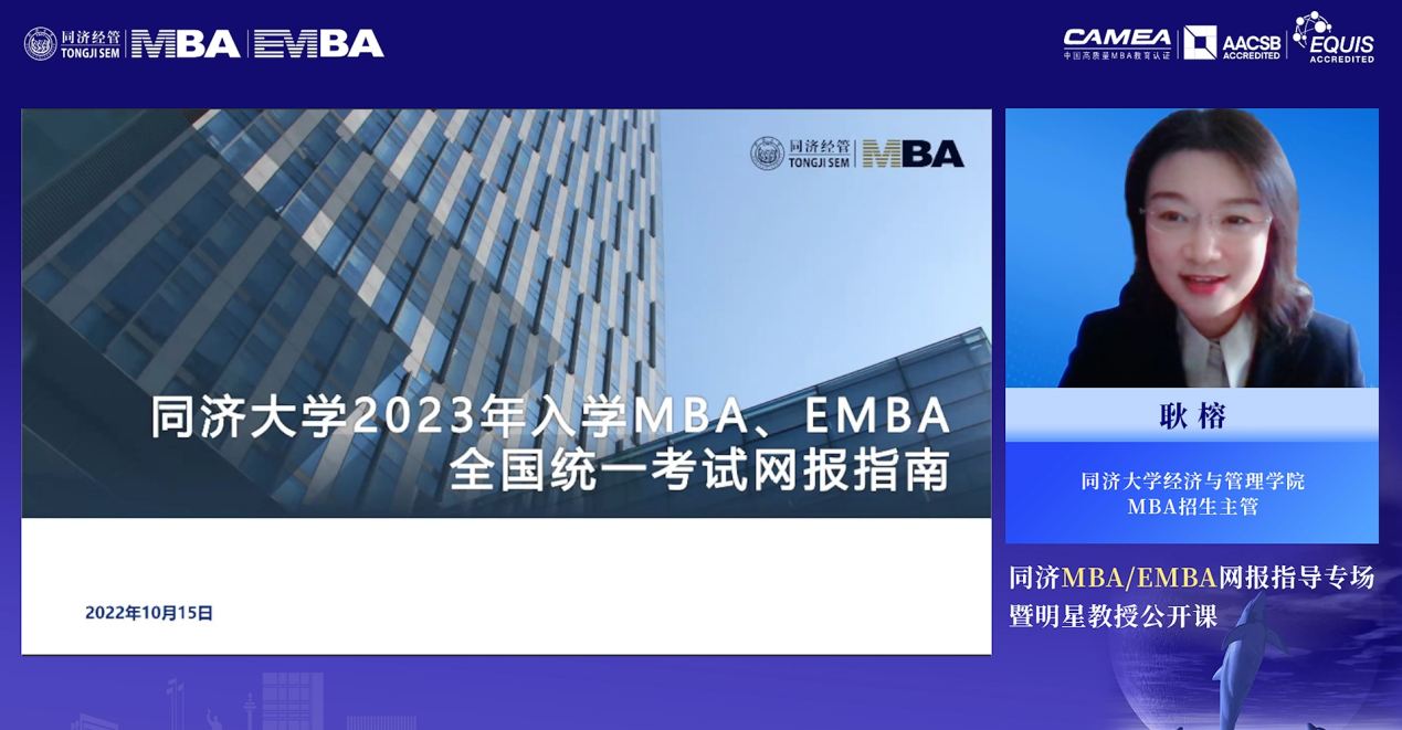 同济大学经济与管理学院MBA招生主管耿榕对MBA、EMBA网报信息做详细介绍。2023年联考网上报名时间为2022年10月5日至10月25日9:00—22:00,逾期不再补报,也不得修改报名信息。预报名成功后,报名数据有效,不需要在正式报名阶段再次报名。
