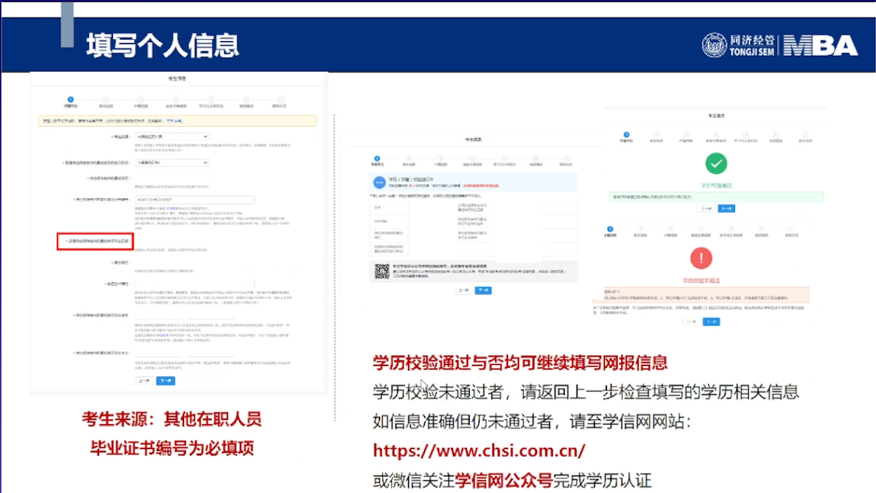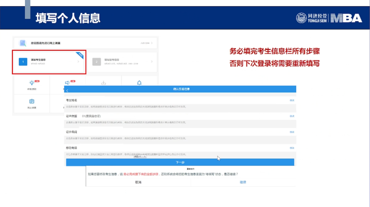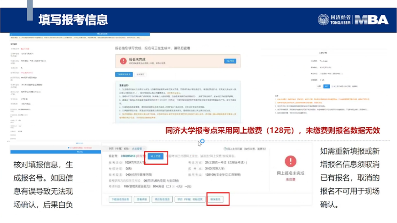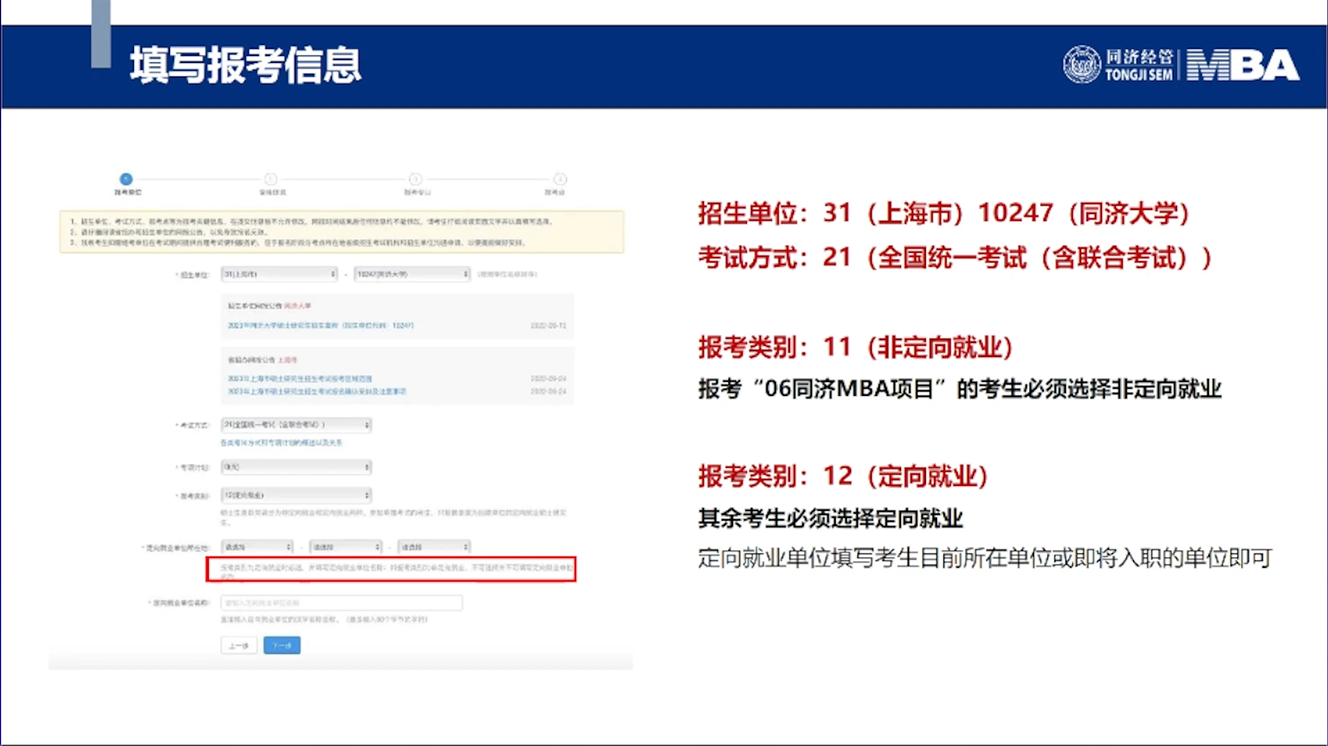 同济大学经济与管理学院MBA招生主管耿榕对MBA、EMBA网报信息做详细介绍。2023年联考网上报名时间为2022年10月5日至10月25日9:00—22:00,逾期不再补报,也不得修改报名信息。预报名成功后,报名数据有效,不需要在正式报名阶段再次报名。
