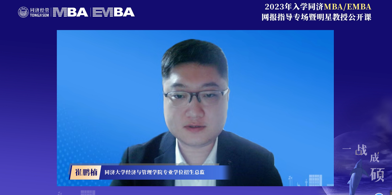 为积极响应疫情防控要求,2023年入学同济MBA/EMBA网报指导专场活动暨明星教授公开课采取线上直播方式举行。本次活动由同济大学经济与管理学院专业学位招生总监崔鹏楠主持,设置公开课演讲、校友及学生分享、网报流程指导说明三个环节。同济大学经济与管理学院MBA/EMBA学术主任苏涛永教授,同济大学经济与管理学院MBA招生主管耿榕,同济大学经济与管理学院2009级EMBA校友、EMBA戈友会理事长、上海冠闵信息科技有限公司COO童琳,同济大学经济与管理学院2019级MBA学生、MBA第十五届联合会主席、上海迅发建设工程有限公司商务副总张忻馨出席参加此次活动。