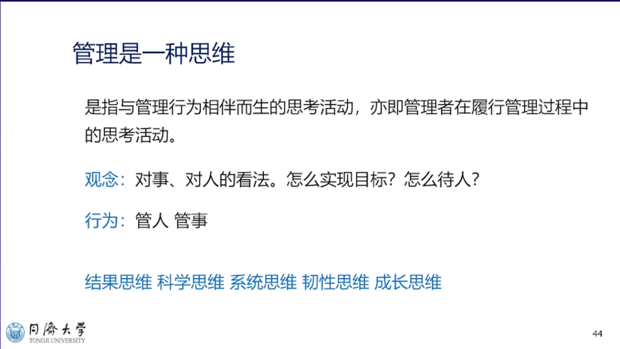 苏涛永教授指出,管理思维是指与管理行为相伴而生的思考活动,即管理者在履行管理过程中的思考活动。从观念来看,它包含对事、对人的看法;从行为来看,它是管人、管事的方法。管理思维分为结果思维、科学思维、系统思维、韧性思维和成长思维五部分,其中,结果思维既关心结果、也关心提供结果的人;泰勒思维也叫泰勒制,以规划、预测为基础进行事前决策;系统思维谋划全局,强调整体观念;韧性思维注重在不可预测、错综复杂的环境中寻求稳定;成长思维则重视从挫折失败中不断改善进步。