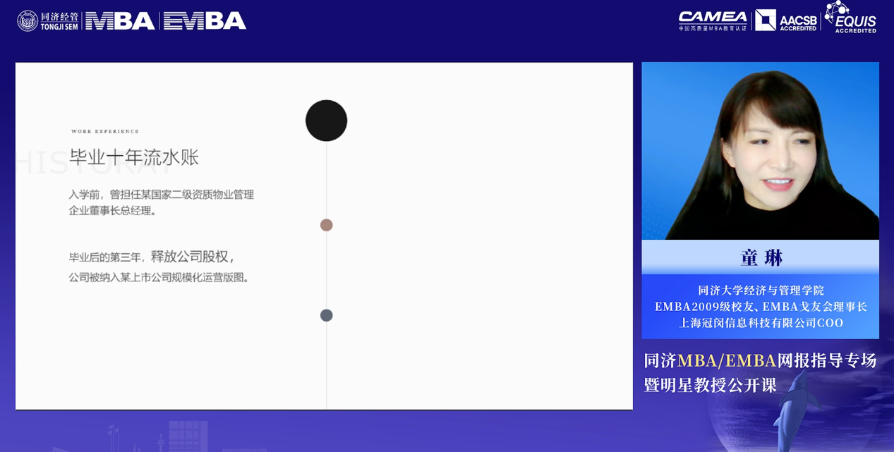 同济大学经济与管理学院2009级EMBA校友、EMBA戈友会理事长、上海冠闵信息科技有限公司COO童琳以《毕业十年——我的EMBA感悟》为主题展开分享。入学同济之前,童琳曾担任某国家二级资质物业管理企业董事长总经理,为了系统学习商业领域通识教育、开拓眼界和思路,她选择报考被称为地产界“黄埔军校”的同济EMBA项目。毕业后三年,公司被纳入某上市公司规模化运营版图,她尝试过停车场无感支付、多学科会诊等创业项目,目前担任公有云计算项目企业首席运营官。