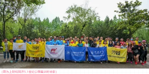 今天凑巧上财、交大高金、东华和同济EMBA也都在世纪公园集训,几个学校的老沙友们见面气氛自然是十分的热烈。跑团成员都非常默契地替换上了运动服饰,然后排成整齐的队列开始了今天的——摆拍。